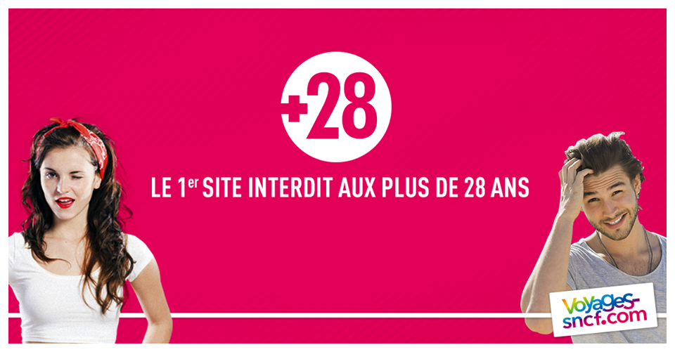 En effet, Voyages-Sncf.com lance un site dédié interdit aux plus de 28 ans qui prend les allures d’un site de charme en reprenant les couleurs, les symboles et les photos floues mais sans vulgarité. Sur 28max.com on retrouve ainsi le meilleur coup de l’année avec la carte Jeune, des expérimentations à 3 avec les offres mini-groupe et tous les bons coups les plus chauds de l’été pour s’éclater au maximum ! Un dispositif digital inédit qui a été réalisé par l’agence Proximity BBDO et qui regroupe pour la première fois sur un même site toutes les offres réservées aux moins de 28 ans.