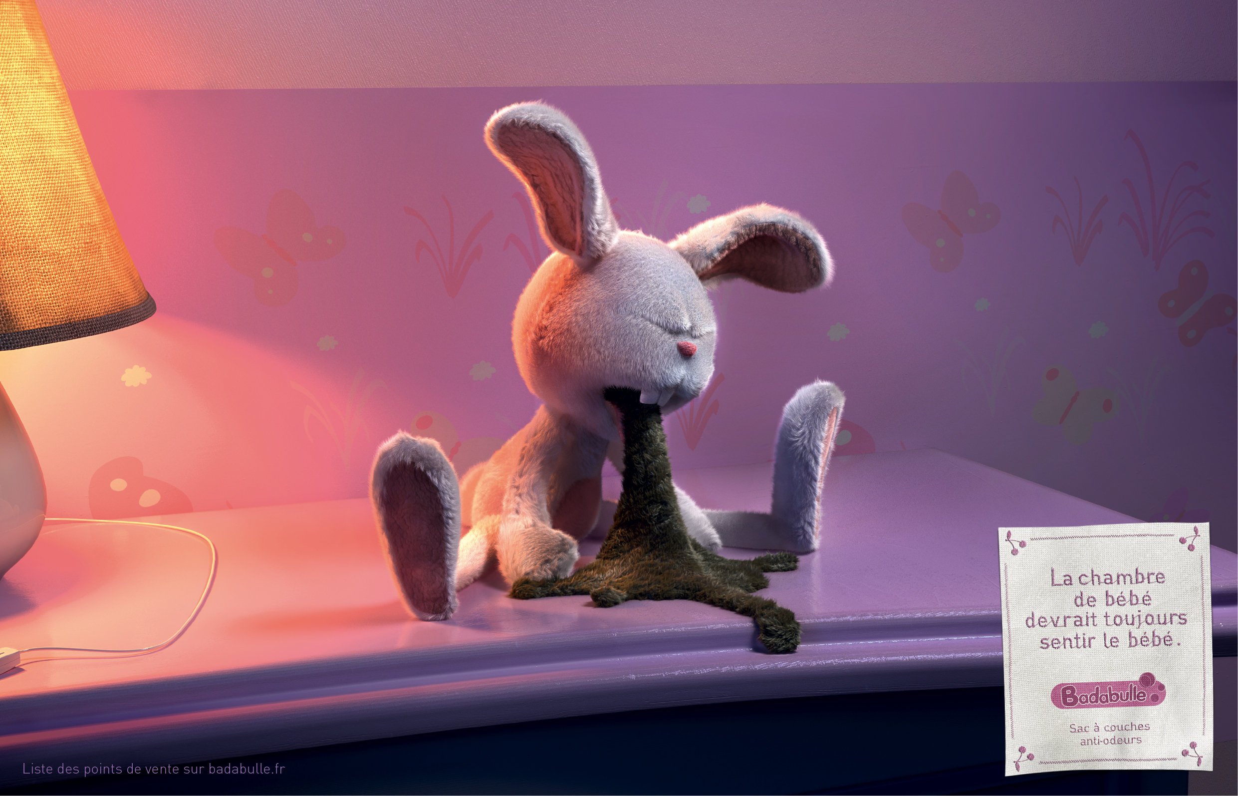 Pour promouvoir ce nouveau produit, la marque française a fait appel à l’agence de communication Publicis Conseil pour la réalisation d’une campagne d’affichage amusante. Ainsi, on découvre un lapin et un ours en peluche qui vomissent (de la peluche !) à force de cohabiter avec les couches usagées à l’odeur insoutenable… Un calvaire qui prend fin grâce aux sacs Badabulle !