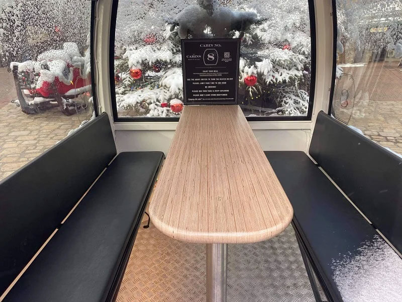 Equipées d'une table, de bancs, de lumière et de haut-parleurs, ces cabines chauffées et fermées peuvent recevoir 4 à 6 personnes