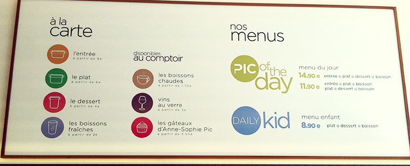 Derrière l’étiquette gastro, se cache une carte des plus accessibles, mise à jour tous les mois avec un menu du jour différent tous les jours à moins de 15€ composé d’une entrée, d’un plat et d’un dessert. Servie dans des bocaux en verres, la cuisine d’Anne Sophie PIC se consomme sur place ou à emporter au Daily PIC où vous dégusterez des plats de saison d’une grande qualité aux saveurs marquées et à la présentation soignée.