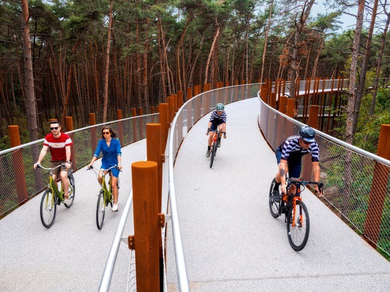 cette piste cyclable circulaire de 700m de long sur 3m de large est suspendue à 10m au-dessus du sol et donne l'opportunité de faire le tour d'une partie de la forêt de Bosland