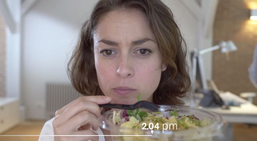 Ainsi, une femme se fait prendre en photo le matin juste avant de partir travailler puis le soir en rentrant chez elle. Entre temps, équipée d’une caméra, elle nous a fait suivre sa journée du moment où elle dépose les enfants à l’école, au travail, en passant par son cours de gym, les courses et le moment où elle récupère ses enfants et rentre chez elle.