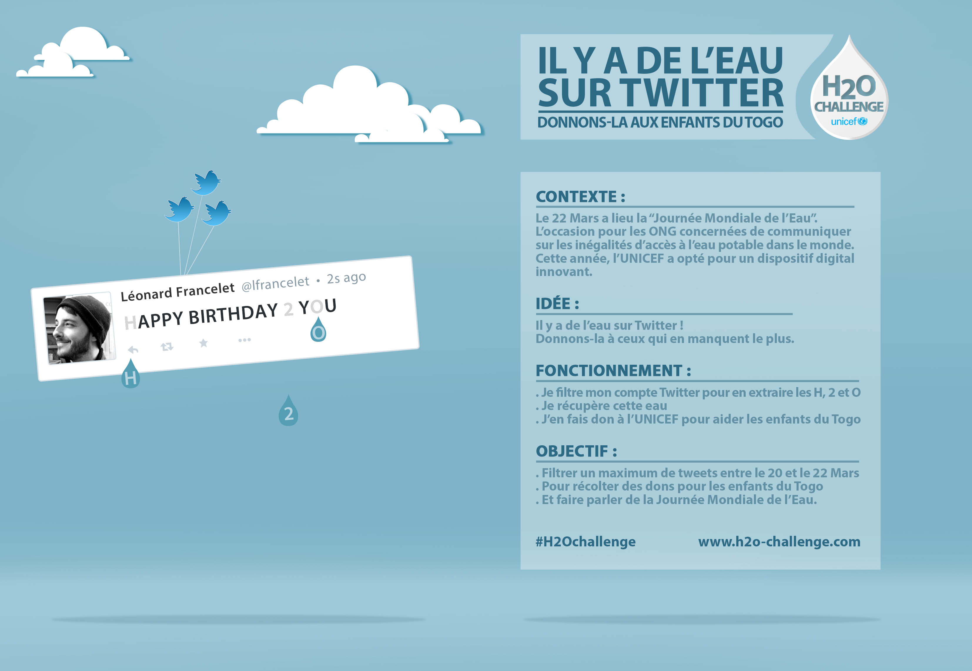 Une opération caritative unique puisqu’elle est réalisée sans achat média et qui ne se contente pas d’utiliser Twitter comme relai de communication mais qui en fait le coeur de son dispositif ! Rendez-vous vite sur votre compte Twitter pour filtrer votre « eau » et parlez en autour de vous : plus nous serons nombreux à faire un geste pour cette cause essentielle, plus les enfants du Togo auront de l’eau potable !