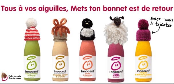 Depuis quelques années, à l’arrivée de l’hiver, les bouteilles de smoothies Innocent s’habillent d’un petit bonnet en laine. Est-ce parce qu’il fait trop froid dans les rayons des supermarchés ? Ça pourrait… Il s’agit en fait d’une opération caritative en faveur de l’association Les Petits Frères des Pauvres qui vient en aide aux personnes âgées isolées, en situation de pauvreté et d’exclusion.