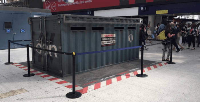 A cette occasion, Universal Pictures UK a surpris les londonien à la gare de Waterloo en installant un container géant à l’effigie de l’entreprise INgen. Les fans se souviendront forcément de cette entreprise fictive qui avait créé le fameux parc d’attraction dans le premier volet, sortie en 1993. Et dans le film, ces containers renfermaient des vélociraptor…