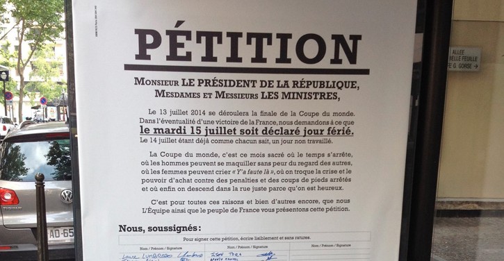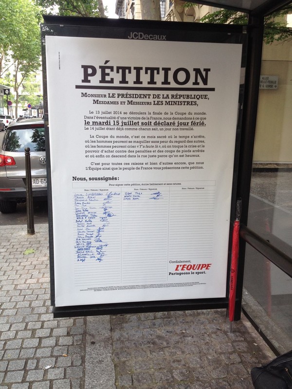 Affichée sur les abribus et accessible en ligne, cette pétition demande à ce que le 15 juillet devienne un jour férié en cas de victoire de la France au Brésil ! La finale ayant lieue le 13 juillet et le 14 étant la fête nationale, si l’équipe de France de football devient championne du monde, cela permettrait de prolonger la fête. Et une fois toutes les signatures récoltées, la pétition sera remise au gouvernement….
