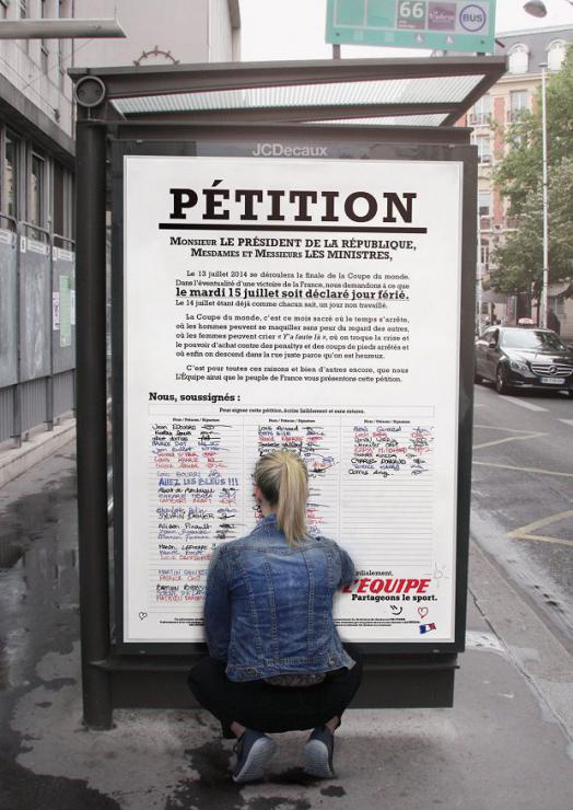 Une manière originale de rebondir sur l’événement de l’année et toucher le plus grand nombre, lecteur ou non du journal l’Equipe… Alors joignez vous à l’élan national, signez la pétition sur les abribus ou connectez-vous sur le site de l’Equipe. Et surtout allez la France !