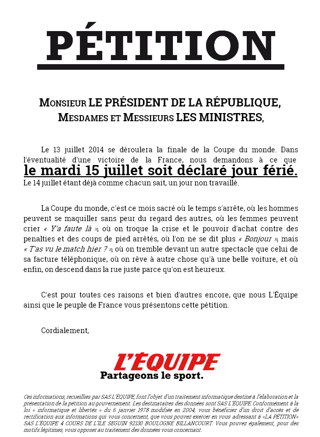 Le quotidien sportif lance une pétition pour que le 15 juillet 2014 devienne un jour férié si la France remporte le mondial de foot…