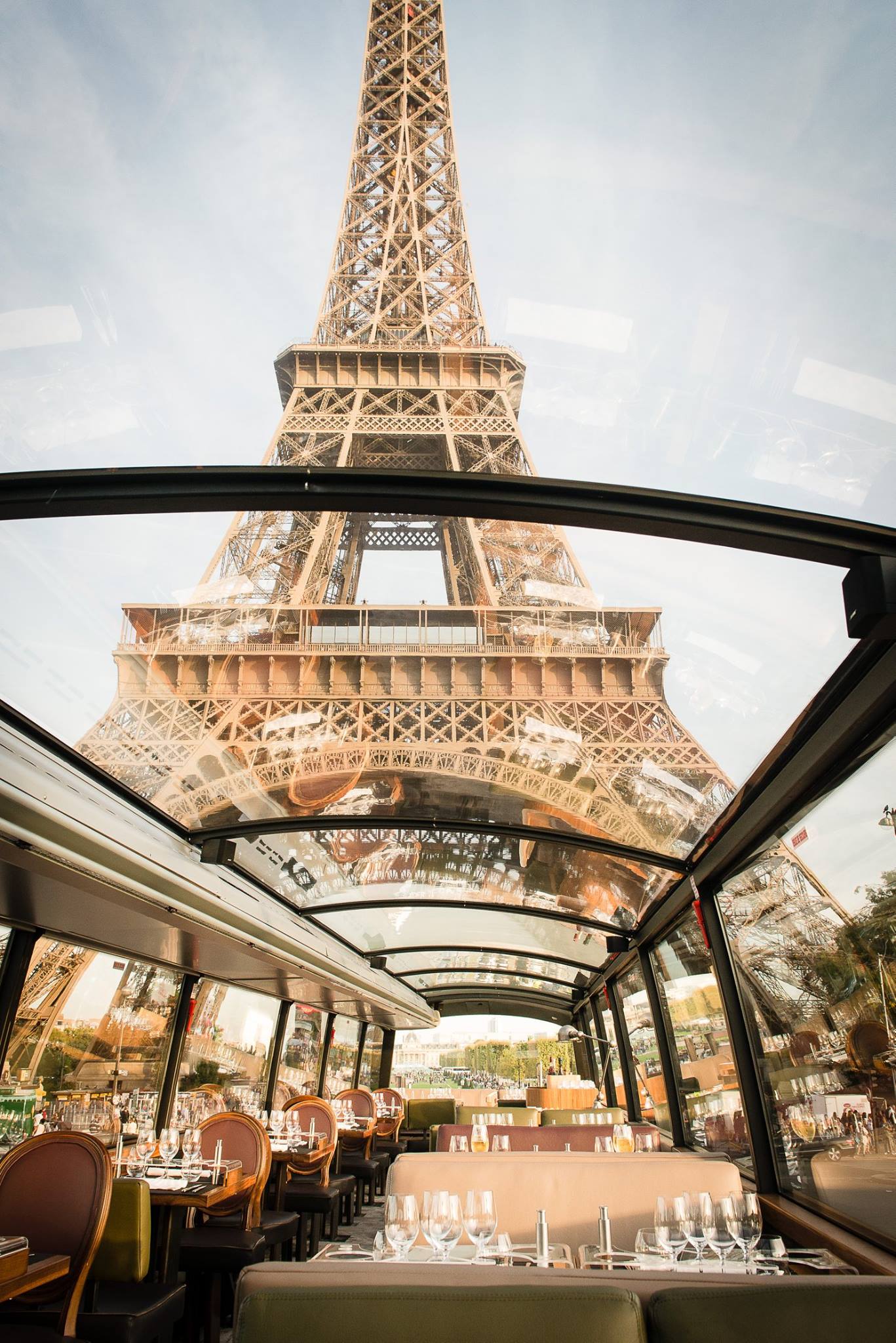 Côté architecture, c’est Maxime Faure qui s’est occupé de l’agencement du Bustronome en recréant l’ambiance d’une terrasse parisienne où chaque centimètre a été judicieusement pensé pour assurer un confort optimal aux voyageurs lors de leur visite. Un bus impérial, composé d’une magnifique verrière permettant une vue panoramique sur tous les monuments de Paris, ambiance féerique assurée dès la nuit tombée ! En plus des Audiopen, pour tout connaître des monuments qui vous entourent, le chauffeur marque un temps d’arrêt devant chaque monument afin que vous puissiez vous imprégner de leur beauté.