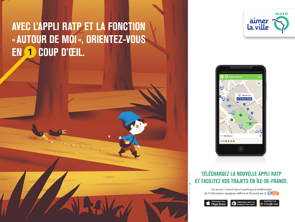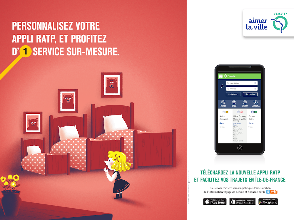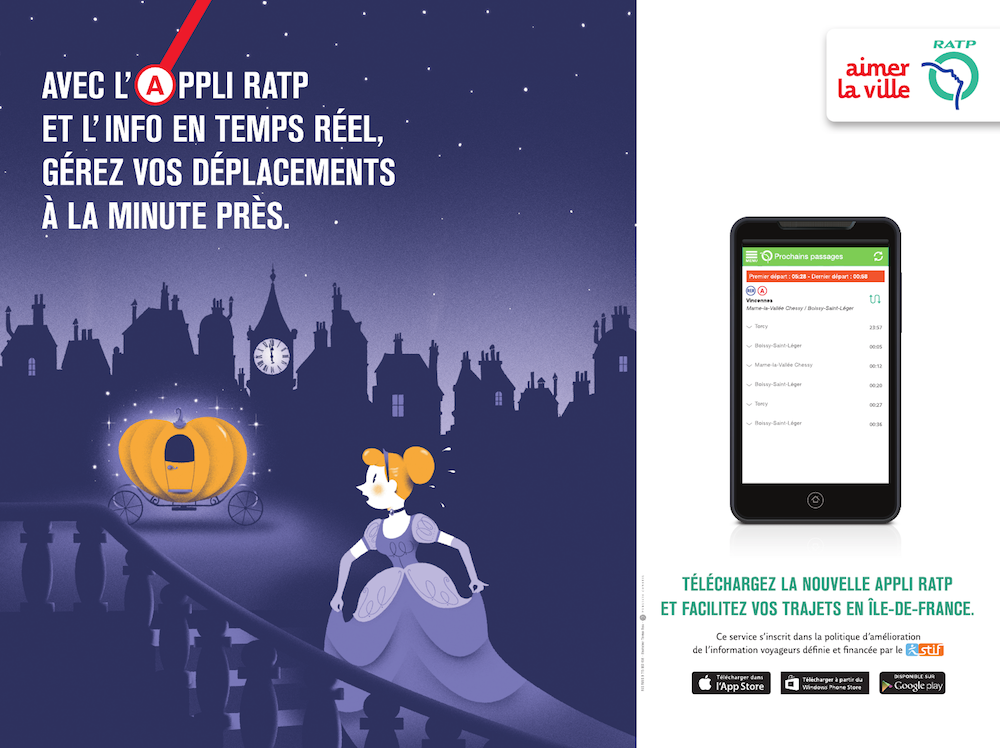 Ainsi, ils ont mis en scène les différentes fonctionnalités offertes par cette nouvelle application RATP dans une série de trois visuels merveilleux qui se déclinent en affichage, Numériflash, volet digital et mobile avec nos personnages de contes préférés. Et contrairement à Boucle d’Or, Cendrillon et le Petit Poucet, les franciliens ont désormais accès à un service sur mesure, ils peuvent retrouver leur chemin grâce à la géolocalisation et l’option « autour de moi » mais également gérer leurs déplacements à la minute avec les infos en temps réel…