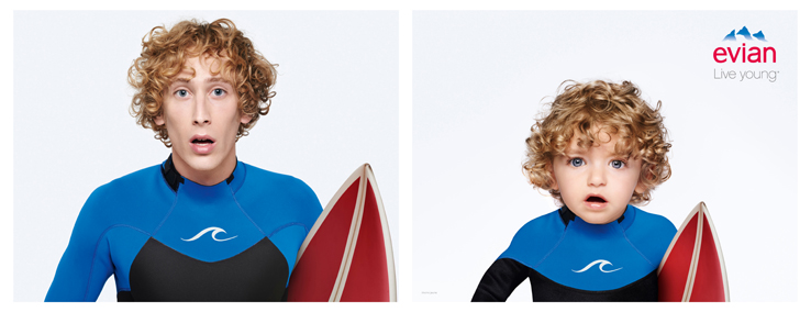 Cette publicité met en scène un surfeur qui tombe dans une vague et qui se réveille… sur la plage des bébés Evian. Sur une reprise des Beach Boy “Kokomo” interprété par Lilly Wood and the Prick, on y découvre alors des mini surfeurs à la fois cool et stylés qui s’échauffent, enfilent leur combinaison et surfent comme des grands, malgré leur taille ! L’effet de l’eau minérale naturelle d’Evian servie à l’unique bar de la plage ?