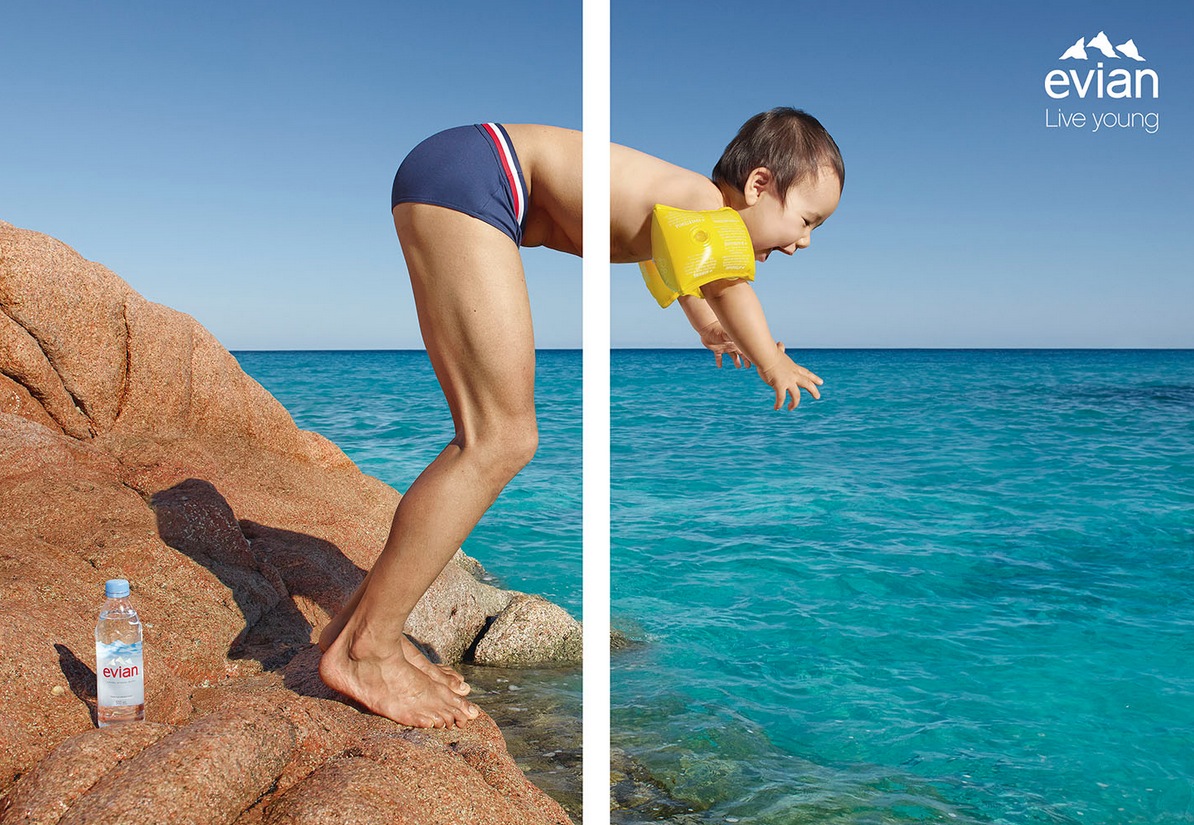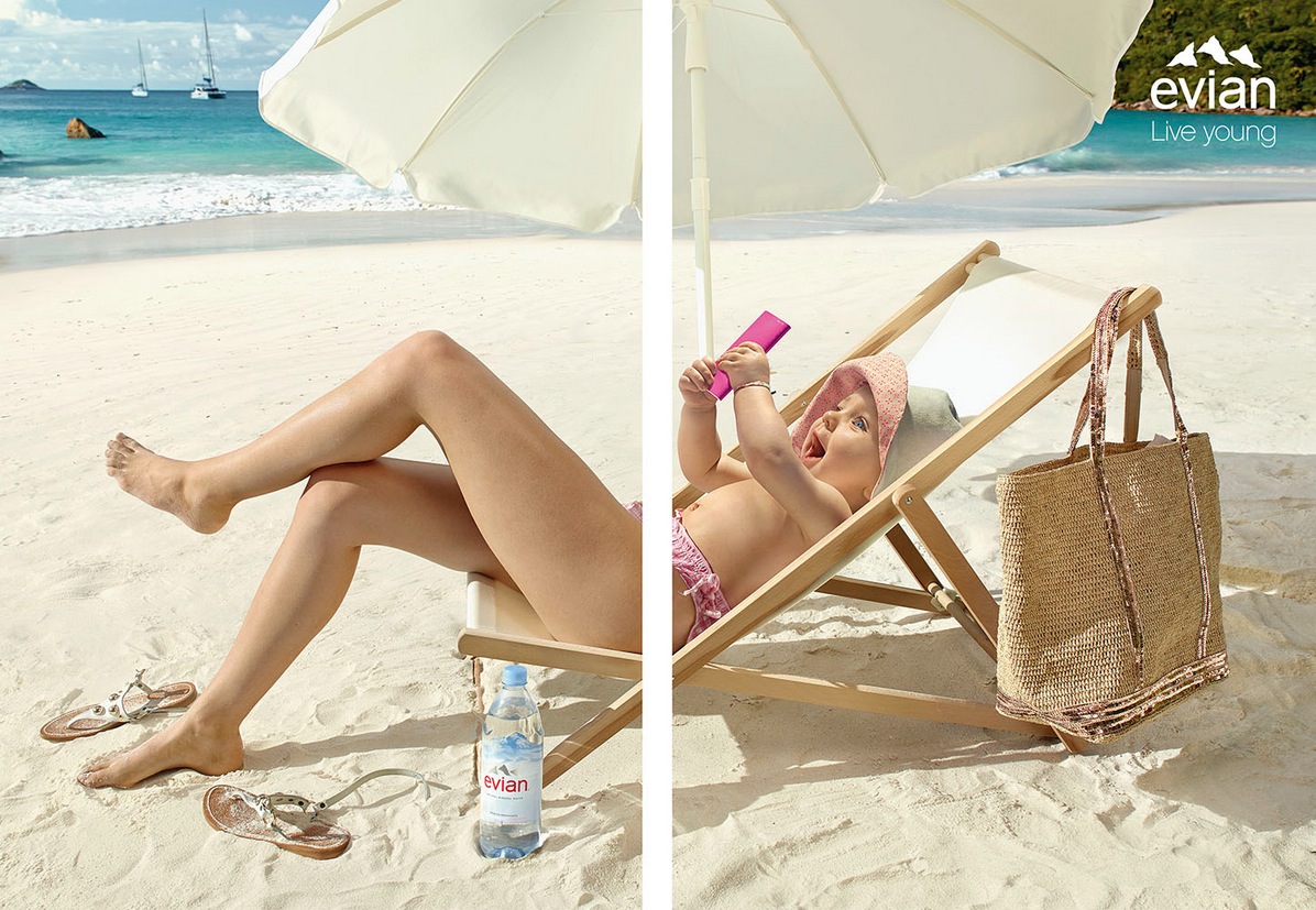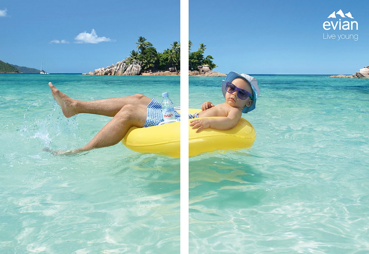 Rappelez-vous l’année dernière, Evian mettait en scène Spiderman Baby dans un spot amusant et décalé. Cette année, Evian continue sur sa lancée avec son slogan Live Young et s’illustre dans une campagne print des plus ensoleillées avec BETC.