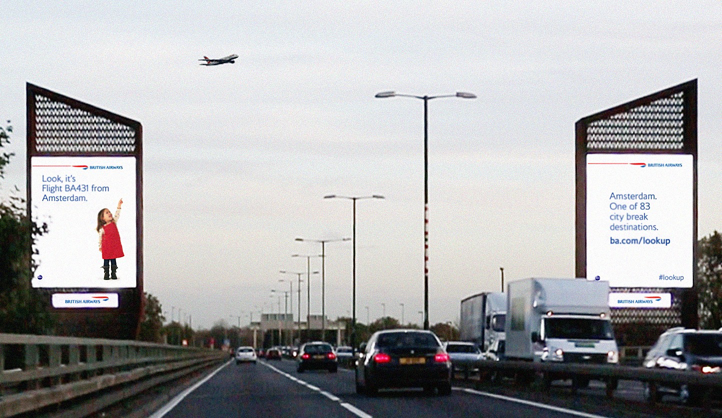 Ainsi, à Londres, la compagnie aérienne British Airways et son agence Ogilvy, après nous avoir permis de visiter les capitales européennes depuis notre ordinateur, s’associent cette fois-ci à Storm, le nouveau réseau digital outdoor de Clear Channel UK, et installent des panneaux publicitaires vidéos inédits sur Piccadilly Circus. En effet, ces panneaux innovants mettent en scène un enfant paisiblement installé, calme et sage, quand tout à coup, un avion de British Airways survole le panneau. L’enfant le pointe alors du doigt en suivant sa trajectoire et nous donne les informations du vol « Regardez, c’est le vol BA475 qui vient de Barcelone ».