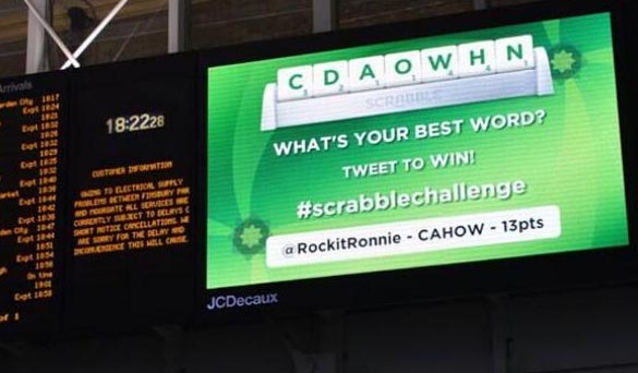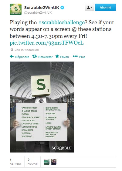 Partant du constat que les gares sont des lieux d’attente et souvent d’ennui, Mattel a eu l’idée de mettre en place un Scrabble géant via Twitter. La marque a donc installé des écrans géants Transvision JC Decaux Live où elle a diffusé des séries de lettres, défiant les passants de trouver le mot le plus long.