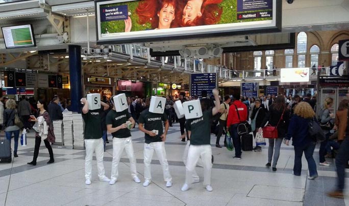 Les voyageurs les plus joueurs doivent ensuite se connecter à Twitter et envoyer leur réponse au compte officiel de scrabble @scrabble2winUK en utilisant le hashtag #scrabblechallenge. En plus du jeu, les passagers ont pu rencontrer des ambassadeurs déguisés en lettres et aux couleurs de Scrabble, dansant, mimant, encourageant et distribuant des boîtes de jeux gratuits aux gagnants.