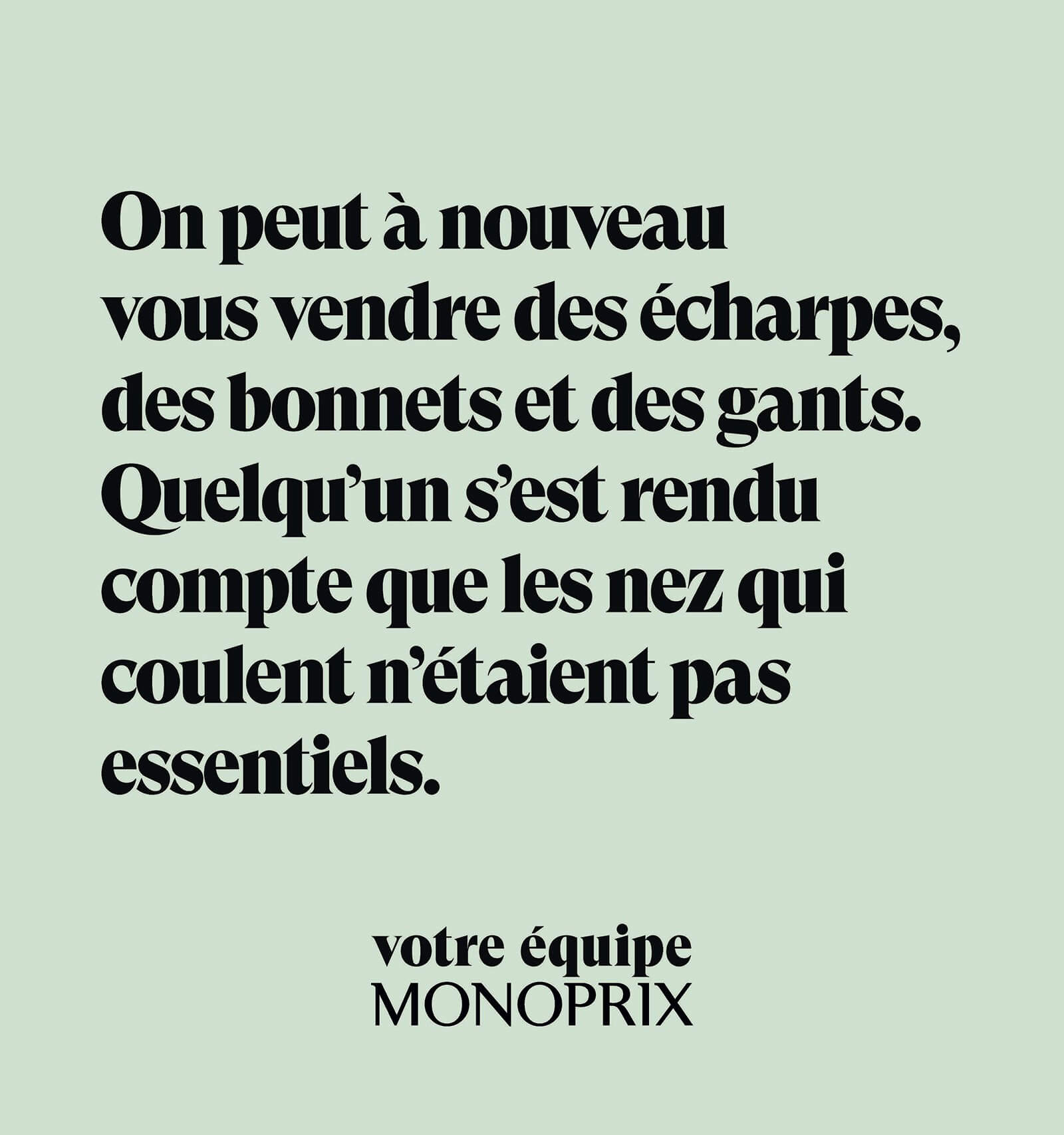 on peut à nouveau vous vendre des écharpes, des bonnets et des gants : quelqu'un s'est rendu compte que les nez qui coulent n'étaient pas essentiels