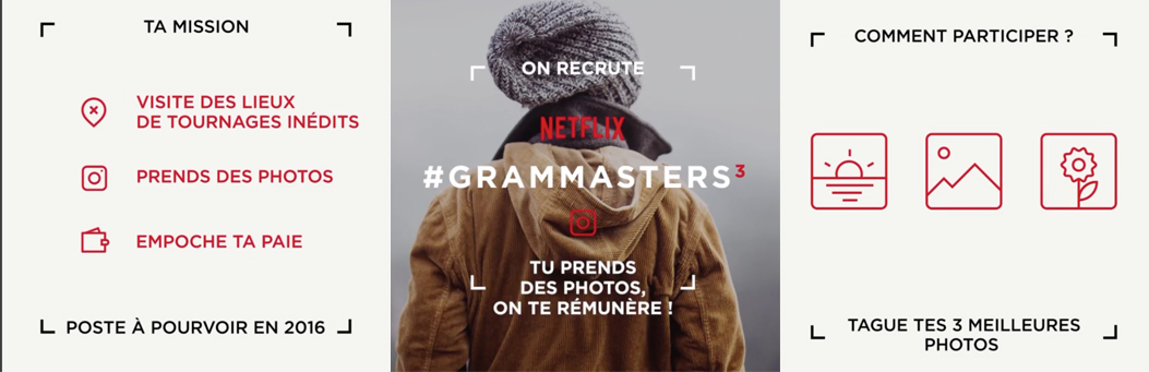 Ça vous fait rêver ? Alors rendez-vous sur Instagram jusqu’au 6 mars pour postuler, en taguant vos trois plus belles photos avec le hashtag #Grammasters3. C’est la 3e année consécutive que Netflix lance ce concours mais c’est la première fois qu’il est ouvert à la France ! Alors même si la concurrence est rude, ça vaut le coup de tenter sa chance…
