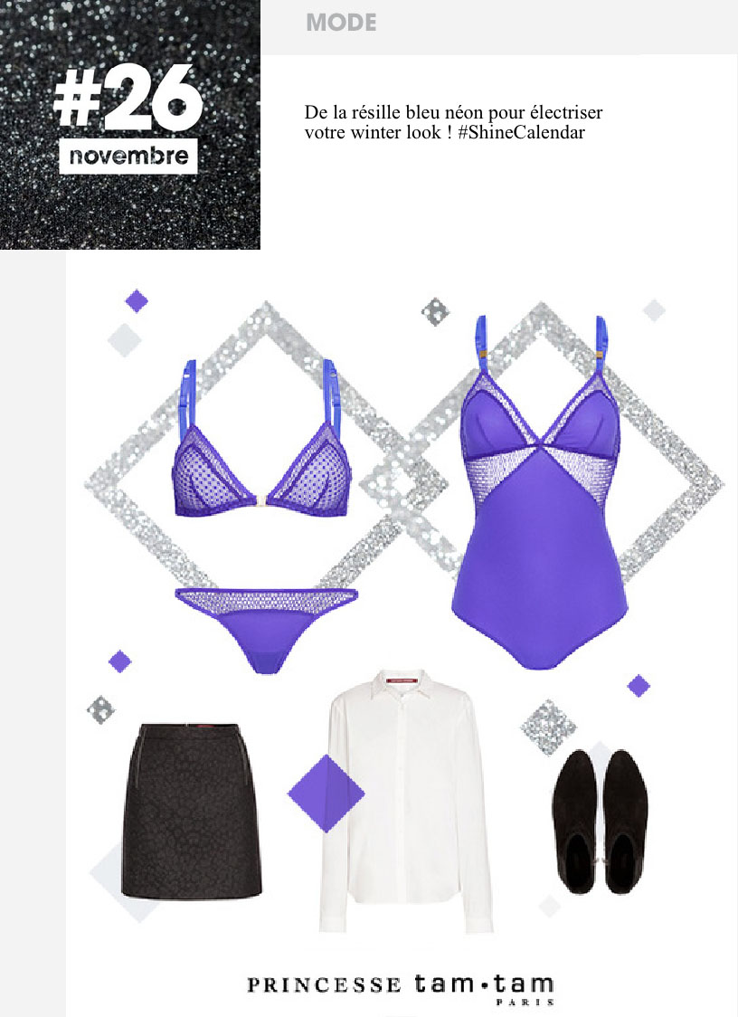 Réalisé par l’agence Les Gaulois, le #ShineCalendar est accessible sur un mini-site dédié shinecalendar.princessetamtam.com et propose de vivre une véritable expérience de princesse qui rendra les fêtes encore plus étincelantes. Une opération brillante qui est accompagnée d’un jeu concours avec à la clef une mise en beauté pour la dernière soirée de l’année, comprenant une robe paillettes, une paire de chaussures paillettes créée en collaboration avec la marque Chatelles ainsi qu’une palette ombre à paupières Color Riche NUDE L’Oréal Paris.