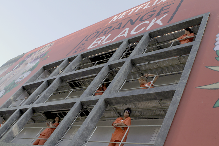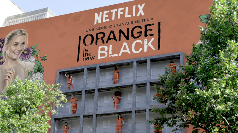 D’une surface de 360m², cet espace publicitaire recouvre un bâtiment entier en reprenant en fait le décor de la prison avec des cellules où de vraies détenues sont enfermées ! Une mise en scène insolite qui immerge les passants dans l’univers d’Orange is The New Black dont la saison 3 sera diffusée dès le 12 juin sur Netflix.