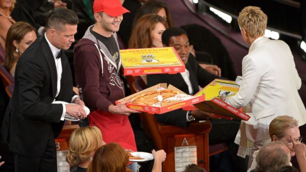En bonne maîtresse de cérémonie, Ellen s’est aussi souciée de l’appétit de son public et a pris l’initiative de commander des pizzas. A l’arrivée du livreur, c’est Brad Pitt qui s’est occupé de distribuer les assiettes en carton tandis qu’Ellen est allée quémander de la monnaie auprès de Sandra Bullock, sous prétexte qu’elle est pleine de sous ! Une séquence drôle à souhait qui s’est terminée par une quête d’Ellen DeGeneres avec le chapeau de Pharrell… En tout cas, je trouve ça très chic la pizza en tenue de soirée !