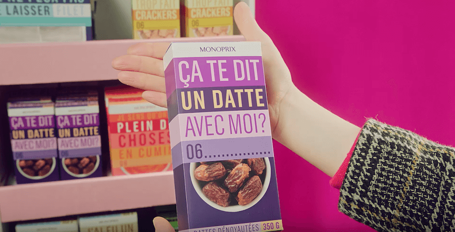 Ainsi, les clients des Monoprix Paris Les Halles, Paris Saint-Paul et Lyon GBL (Cordeliers) vont pouvoir « avoir un coup de poudre » sur quelqu’un qui les aura fait totalement « crackers » et qu’ils ne voudront pas laisser « filet » alors ils pourront lui proposer un « datte » ou « un petit vert » car ils ont sûrement plein de choses en « cumin » alors pourquoi ne pas « sorbet » ensemble ? Et Monoprix a pensé à tout puisqu’en dessous de cette déclaration, ils pourront même laisser leur 06 !