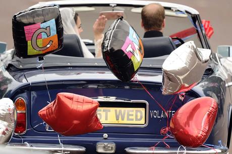 Et pour rejoindre leur résidence londonienne, les nouveaux duc et duchesse de Cambridge sont montés dans un Aston Martin cabriolet immatriculée « Just Wed », trainant des ballons multicolores et où l’on pouvait voir un panneau « L » sur le devant du capot signalant un jeune conducteur au volant.
