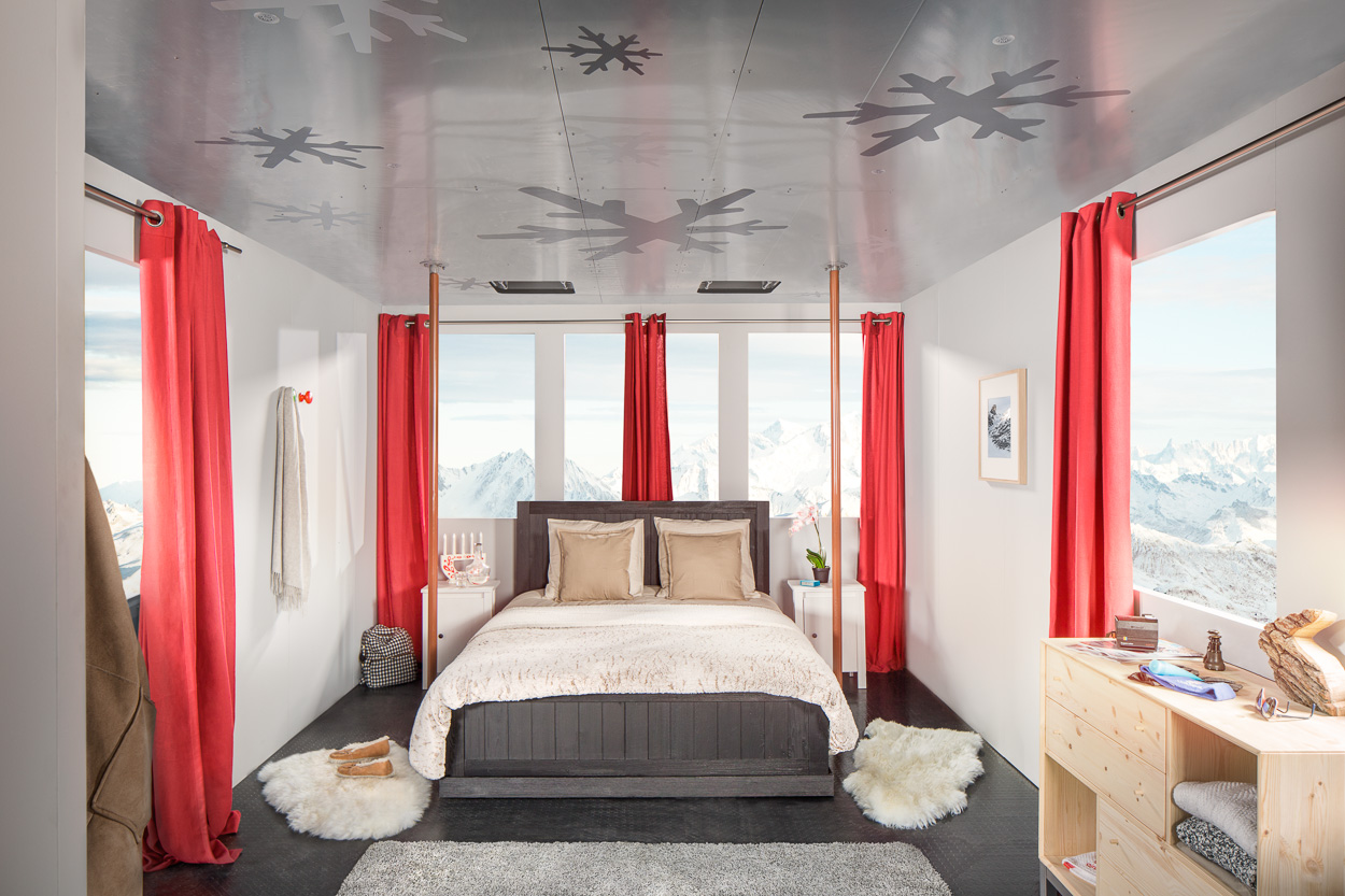 Pour ce faire, Ubi Bene a transformé une cabine de téléphérique de la fameuse ligne suspendue au dessus de la Combe de la Saulire , en un logement cosy et chaleureux pour quatre personnes. Pour atteindre le sommet de la Saulire, les chanceux devront grimper en moto neige où ils seront accueillis par un bon verre de vin chaud.