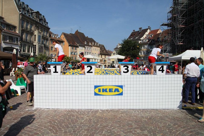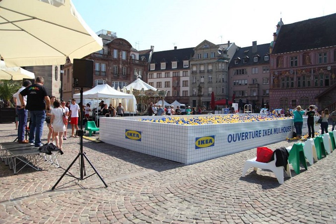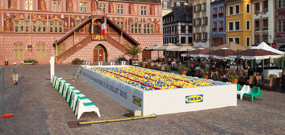 Alors que Ikea s’apprête à ouvrir son premier magasin à Mulhouse, le 29 juillet prochain, l’agence Ubi Bene a été missionnée pour mettre en place une opération insolite sur la place de la Mairie. En effet, l’agence événementielle, réputée pour son originalité et sa créativité a installé une piscine de 15m sur 5m, remplie de balles en plastiques aux couleurs de l’enseigne IKEA.