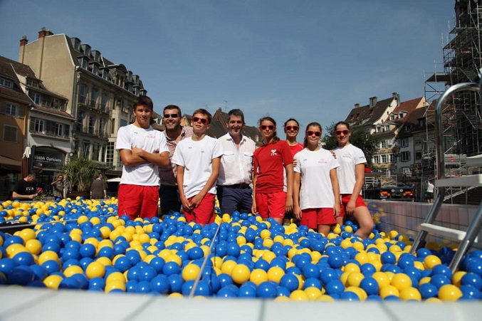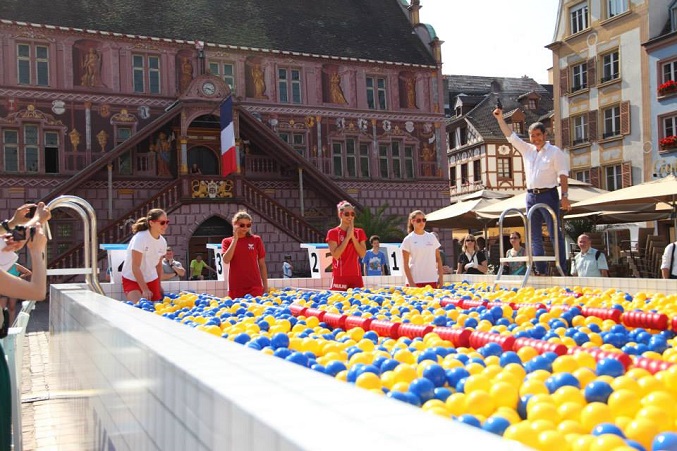 La ville de Mulhouse ayant un réel intérêt pour la natation, notamment grâce au Mulhouse Olympic Natation Club, cette installation a permis aux habitants de tester une nouvelle manière de nager, au milieu de 150 000 balles jaunes et bleues. Et le 3 juillet, le Maire est venu inaugurer ce bassin d’un genre nouveau en donnant le top départ d’une course entre 7 jeunes espoirs du Mulhouse Olympic Natation Club.