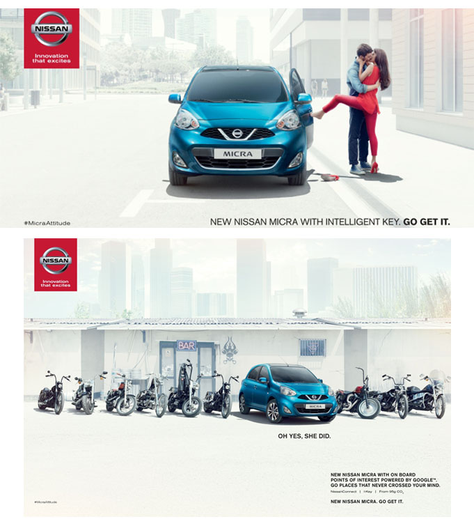 Les agences TBWA G1, London, Else,Paris ont conçu une campagne 100% féminine pour promouvoir sa nouvelle Micra dotée du système de navigation Nissan Connect ainsi que du système Intelligent Key. Intitulée « Micra Attitude », cette campagne met en avant la femme d’aujourd’hui à la fois audacieuse, malicieuse et entreprenante, qui se laisse vivre sans contraintes et qui ne manque pas d’imagination ! Ces films sont accompagnés de deux jolis prints (voir ci-dessous)