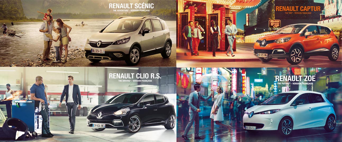 Pour mettre en avant ses nouveaux modèles, Renault, son agence média OMD et Publicis Conseil réalisent une campagne presse sur le thème du cinéma baptisée « Fil Rouge ». A travers quatre visuels lumineux mis en scène par le photographe spécialiste du genre Quentin Shih, on découvre les quatre modèles phares du constructeur évoluant dans un environnement différent en Asie ou en Amérique, en rapport avec le style de la voiture. Un moyen de montrer que la french touch made in Renault n’a pas de frontières…